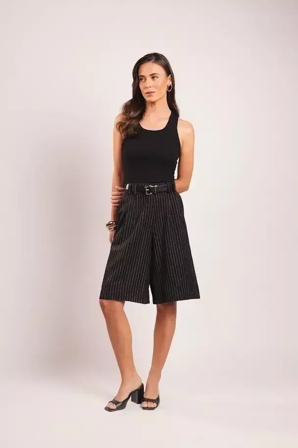 Confeccionada em tecido alfaiataria risca de giz. Esta peça sofisticada possui passante duplo frente e costa, prega dupla na frente e fechamento por zíper e gancho interno. O lábio alfaiataria nas costas e a barra larga garantem um toque de classe. Com comprimento acima do joelho, é perfeita para compor um look refinado e moderno.