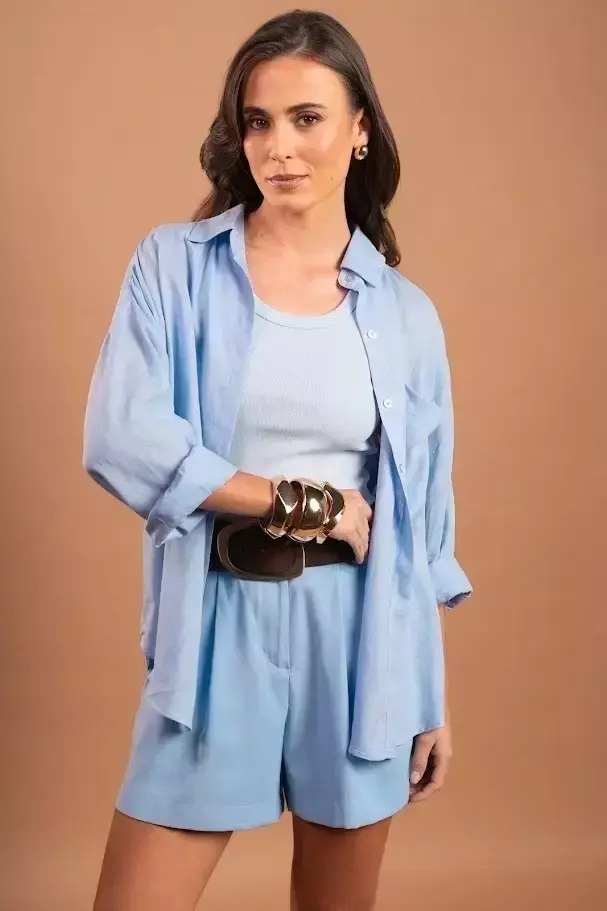 O charme adicional é proporcionado pelos botões de madre pérola, que conferem um brilho sutil e sofisticado à peça.